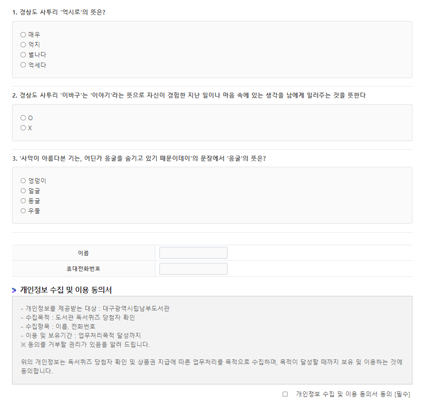 특히 향토 사랑 퀴즈는 참여자 중 5명을 추첨하여