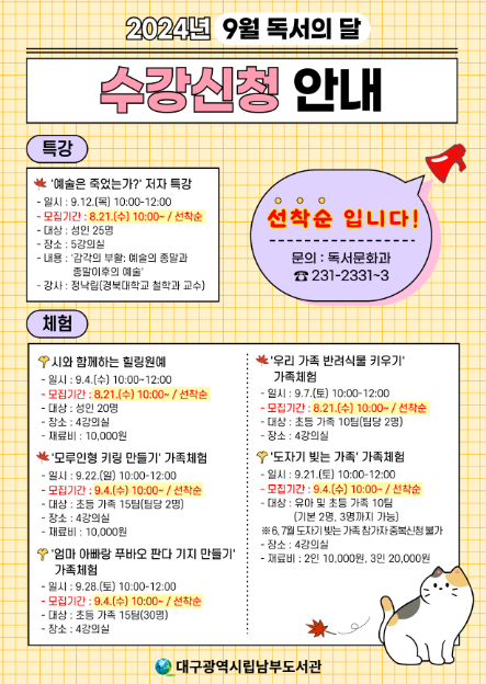 대구남부도서관에서 준비한 2024년 9월 독서의 달 행사는 다양한 프로그램과 이벤트로 가득합니다. 9월 4일 모집이 시작되는 체험 프로그램들을 놓치지 마세요. 지금 바로 신청하여 가족과 함께 특별한 시간을 보내세요!