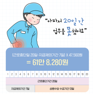 - 예: 근로 중단 15일 - 지급제외 7일 = 47,560원 x 8일 = 380,480원 지급
