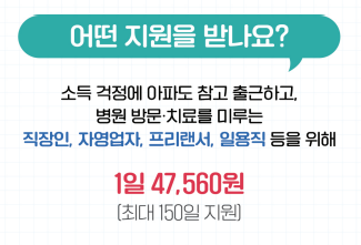 - 퇴원 후 재택치료 또는 통원치료가 필요한 경우, 참여 의료기관에 방문하여 상병수당을 신청할 수 있습니다.