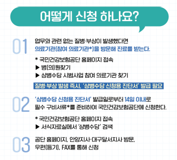 - 진단서를 발급받은 후 14일 이내에 상병수당을 신청해야 합니다.