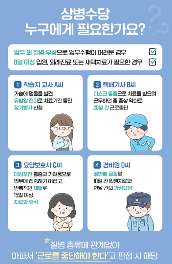 상병수당은 근로자가 업무 외의 질병이나 부상으로 인해 일을 하지 못하는 상황에서 소득을 지원해주는 제도입니다. 이를 통해 경제적인 부담을 덜고 치료에 집중할 수 있도록 돕는 중요한 제도입니다.