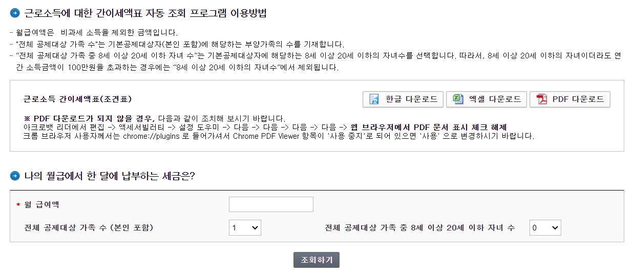 - 간단한 입력으로 사용할 수 있는 상여금 세금 계산기가 없지만, 홈택스의 '근로소득간이세액표'를 이용하면 월급여와 부양가족 수를 입력하여 소득세를 확인할 수 있습니다.