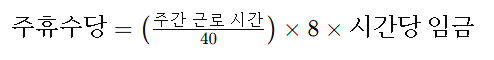 주휴수당은 주당 근로 시간에 비례하여 계산됩니다. 예를 들어, 주 40시간 근무하는 근로자는 하루 8시간의 주휴수당을 받을 수 있습니다. 주휴수당 계산식은 다음과 같습니다.